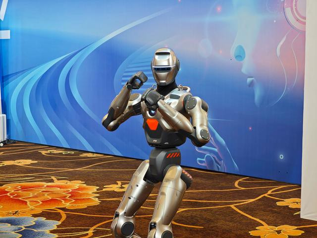 在大会开始前,一段机器人表演吸引了全场的目光。舞台边上的人形机器人正娴熟地演奏着音乐,舞台中央的人形机器人则配合着音乐节奏展示着拳击、踢腿等各类“高难度”动作。这个酷似“武打明星”的人形机器人,来自深圳市众擎机器人科技有限公司。